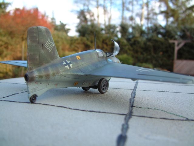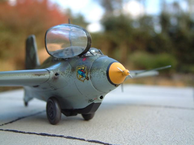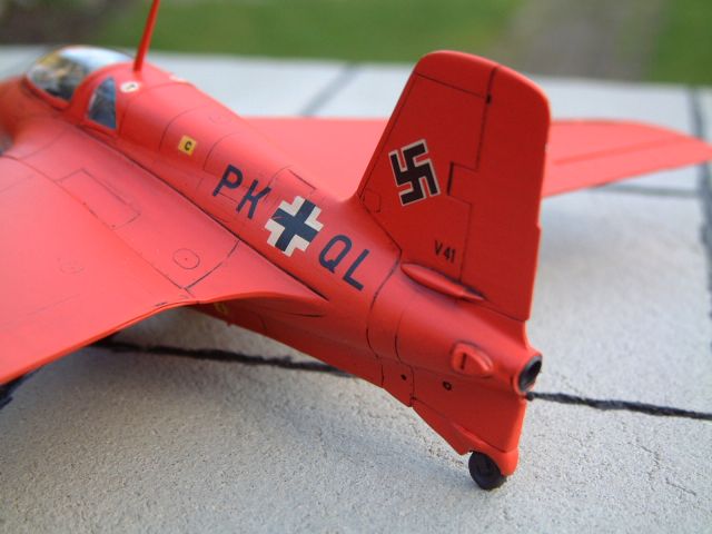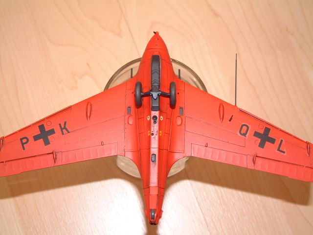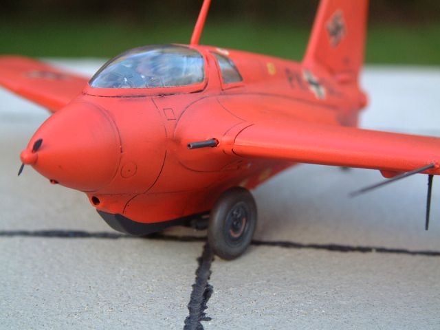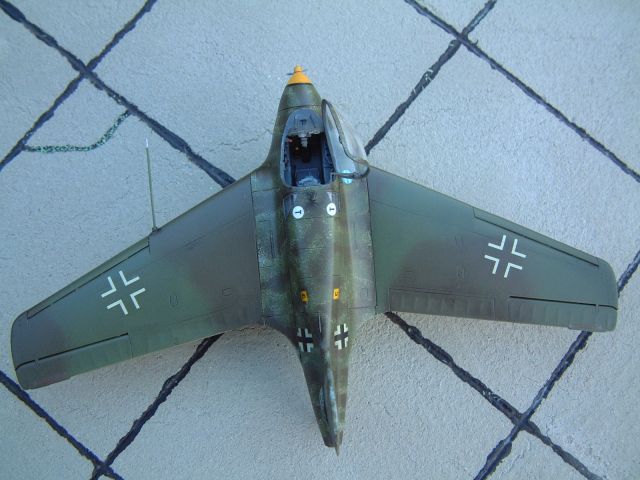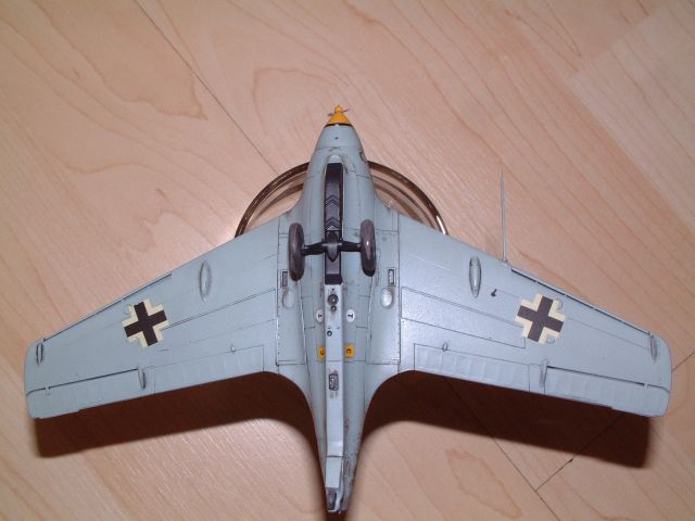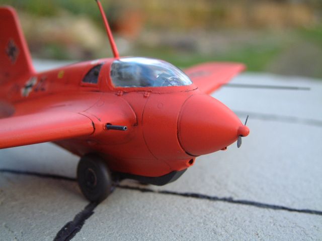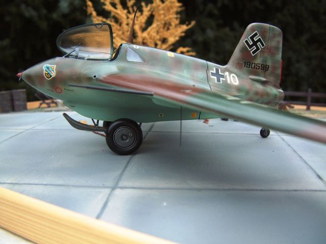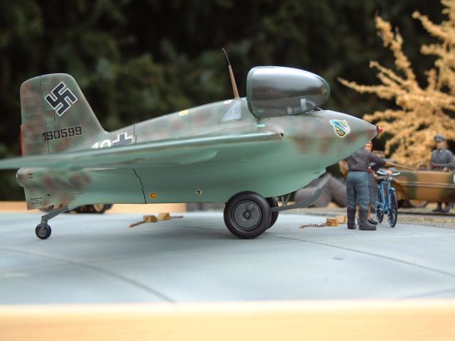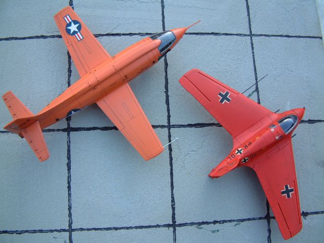 Obwohl ich schon einige ME-163 Modelle gebaut habe, fehlte noch eines im Maßstab 1:48. Da ich sowohl den original Trimaster Bausatz als auch die Revell Variante noch auf "Lager" hatte, baute ich gleich beide. So entstand einmal die hinreichend bekannte rote Maschine von Wolfgang Späte, welche beim EK-16 in Bad Zwischenahn flog und eine Einsatzmaschine des JG 400. Die "Weiße 10" ist das alte Hasegawa Modell in 1:32. Hatte ich vor etlichen Jahren gebaut. Die X-1 mußte einfach mit auf`s Bild. Ich denke man kann daran erkennen wie groß der Technologie-Vorsprung in Deutschland Ende der 40er Jahre war. |